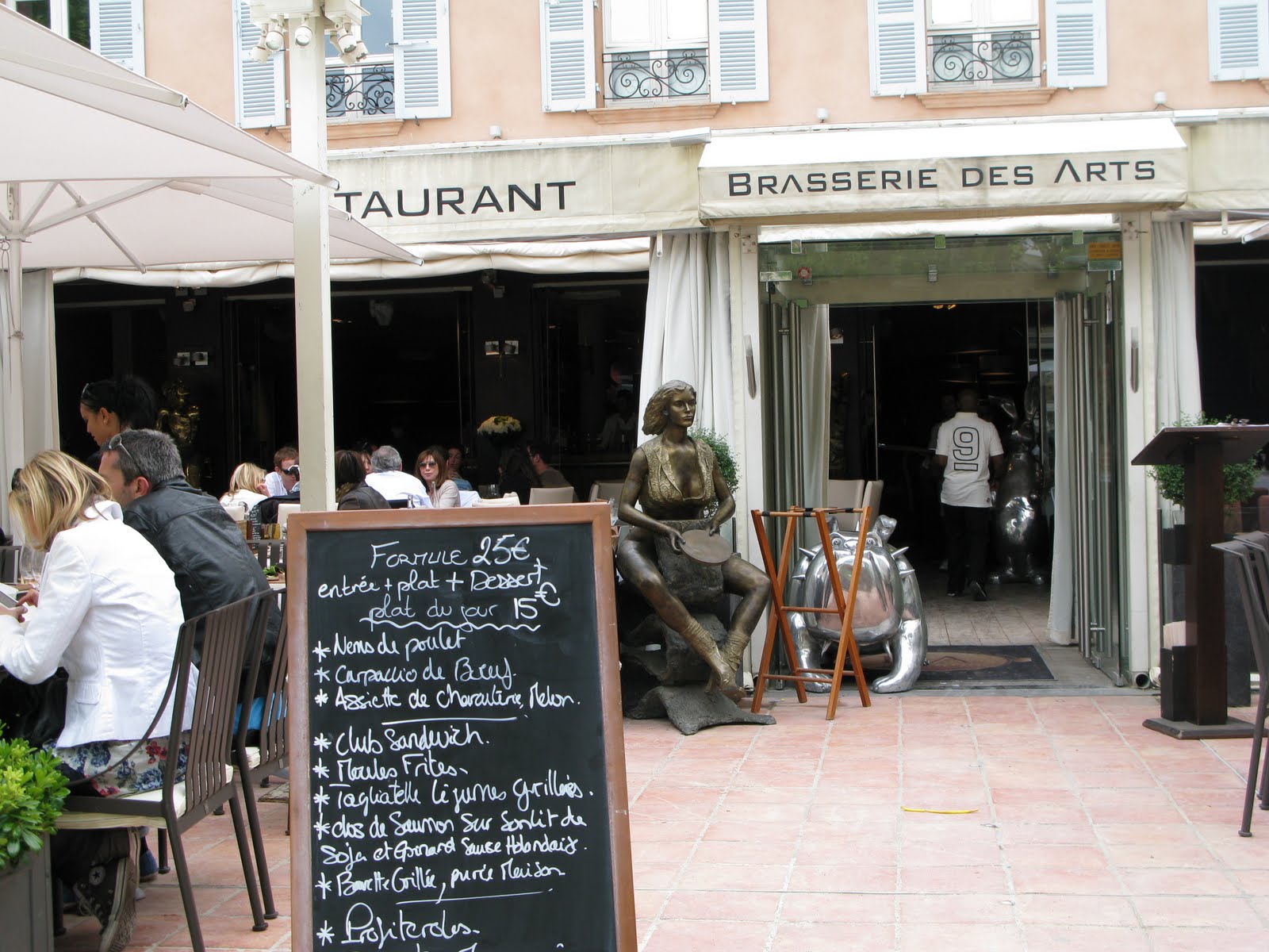 We ate in the Brasserie Des Artes which is situated next to the Boules court and had a good meal. We just went for the main courses as we had eaten out the day before! My Cote de Boeuf was excellent and cooked to perfection and came with fried new potatoes. My wife had Lamb chops which were also excellent, however she had so many that a doggy bag was produced and our dog got a great meal that evening.