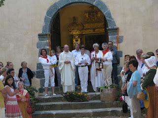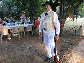 After living in Grimaud for 8 years I discovered that there is a celebration for the summer solstice each year. I arrived at the beautiful old church, which is situated in a field, just outside of the village expecting a few people dancing around a bonfire ( very pagan with vestil virgins!). What I actually found was about 400 hundred villagers seated at tables waiting for grilled sardines to be cooked on loads of barbeques. Free wine was being served and everybody in jovial mood. The Catholic church had made the event into a religious event and a service was taking place inside the church. After the service the locals in Provencal outfits were playing drums and blowing pipes all very noisy! The obligitory speeches took place on the steps of the church and the party began.