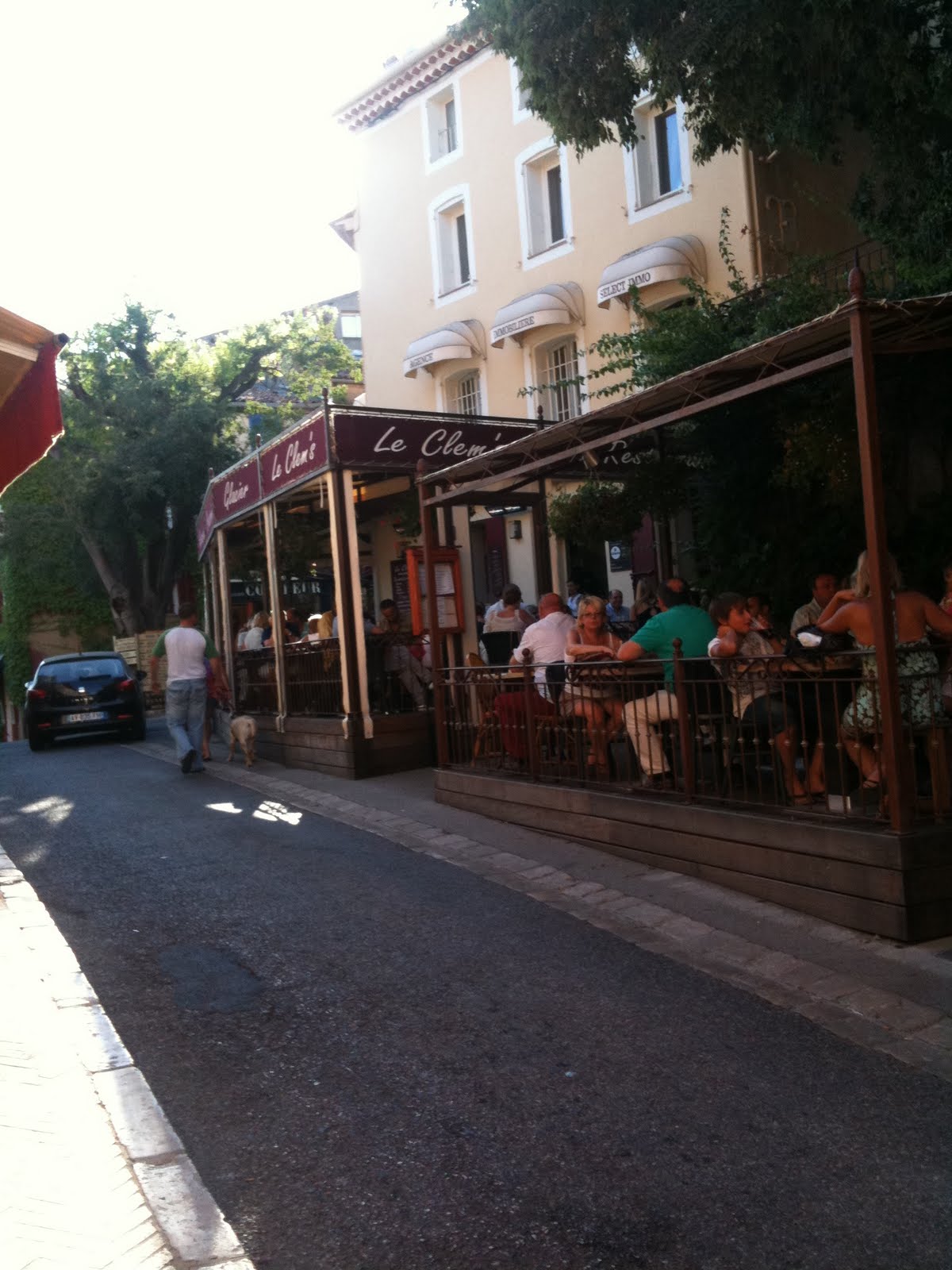 Every Tuesday night during the season the village of Grimaud put on a musical extravaganza in the streets of Grimaud. This commences with the musicians going around the village towards the main square where a stage and audio equipment are erected. The village is full of tourists watching the spectacle.
