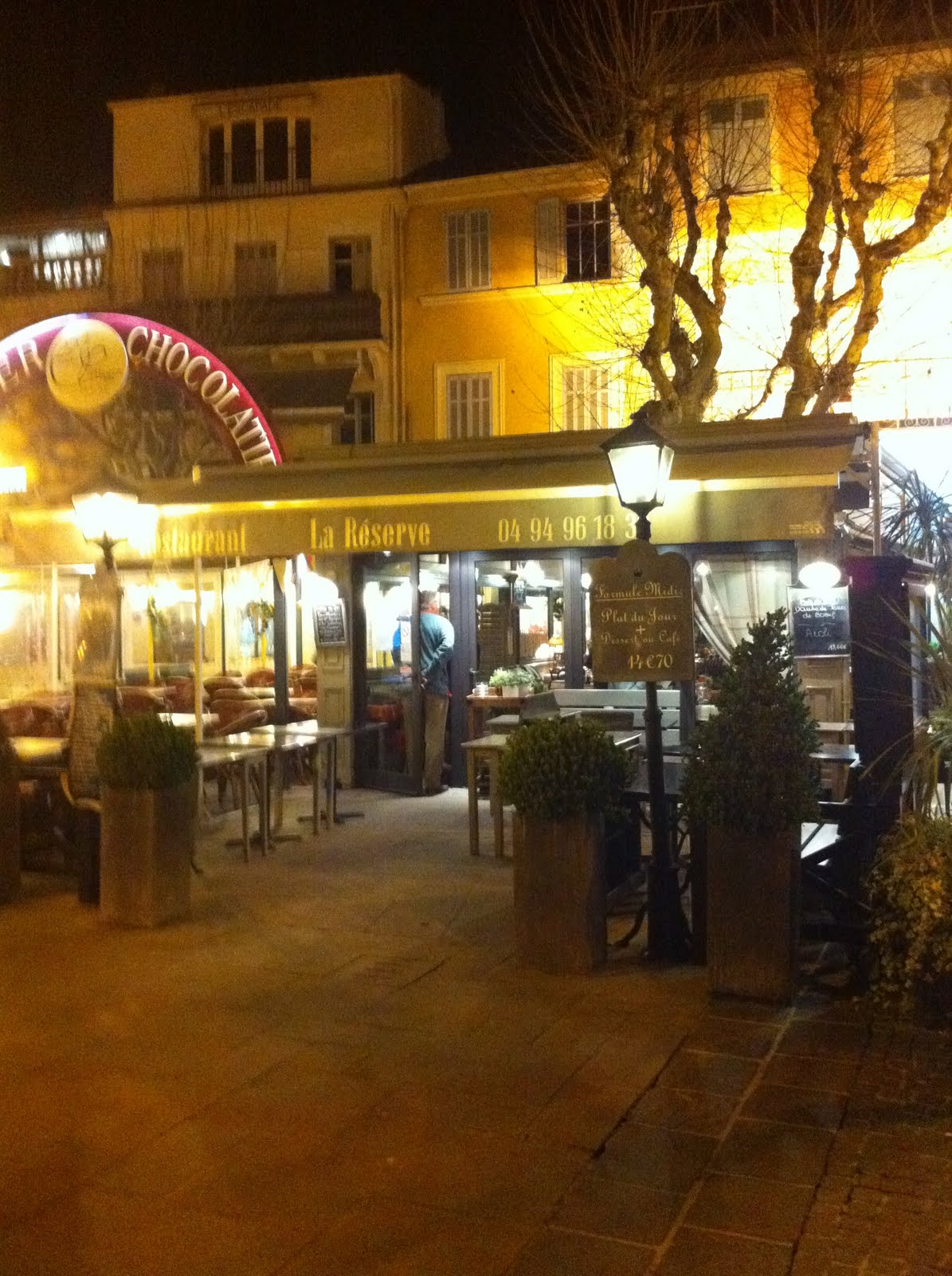 La Reserve is a restaurant, long established, on the promenade of St Maxime. We have been told about it often but have never visited. We finally went last Saturday night and hade a thoroughly good meal. We started with Foies Gras that we shared, though I must admit my wife took very little and me a lot. Served with fig and aspic it was delicious with the warm toast. My friend David and I both had the fondue of steak which comes with a pot of boiling oil on a burner so that one can dip the dices of steak in and cook to the way one prefers, Delicious! This came with vegetables and chips!